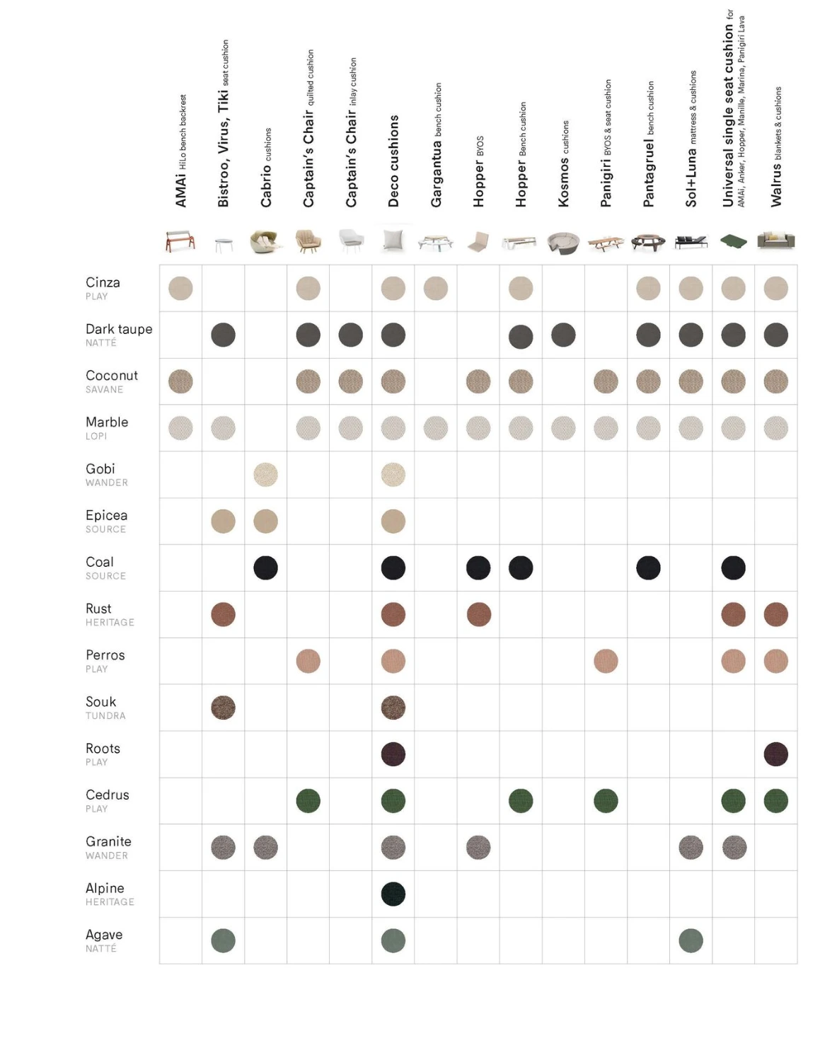 Our calmest color palette features Marble, Coconut, and Dark Taupe, now joined by Gobi, Cinza, Épicéa, and Coal. These tones strike a balance between presence and subtlety, offering soft, natural shades that blend effortlessly into any setting.